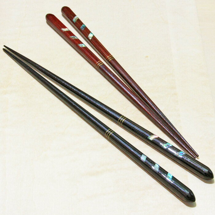商品名:<一双>螺鈿若狭塗 ▼花簪 (イッソウ ラデンワカサヌリ ハナカンザシ) サイズ:【大】23.0cm-黒/黒檀 【中】21.0cm-茶/紫檀 箸タイプ: 天丸四方胴銘木螺鈿若狭塗 材質: 縞黒檀/紫檀(天然木) 耐久性: 標準値 持ち手の太さ: 【大】−標準値 【中】−標準値 重量感: 【大】−やや重い 【中】−やや重い 塗装: 持ち手=ポリエステル類 箸先=拭き漆塗 箸の形状 <持ち手=やや丸みを帯びた4角> <箸先=丸> 原産地呼称: 若狭塗箸 原産地: 福井県小浜市 ◇ご使用上でのお願い ・洗浄時 長時間水に漬け置きますと箸本体の痛みが早まり、木地の反り・膨張による塗装割れの原因となりますのでご注意下さい。