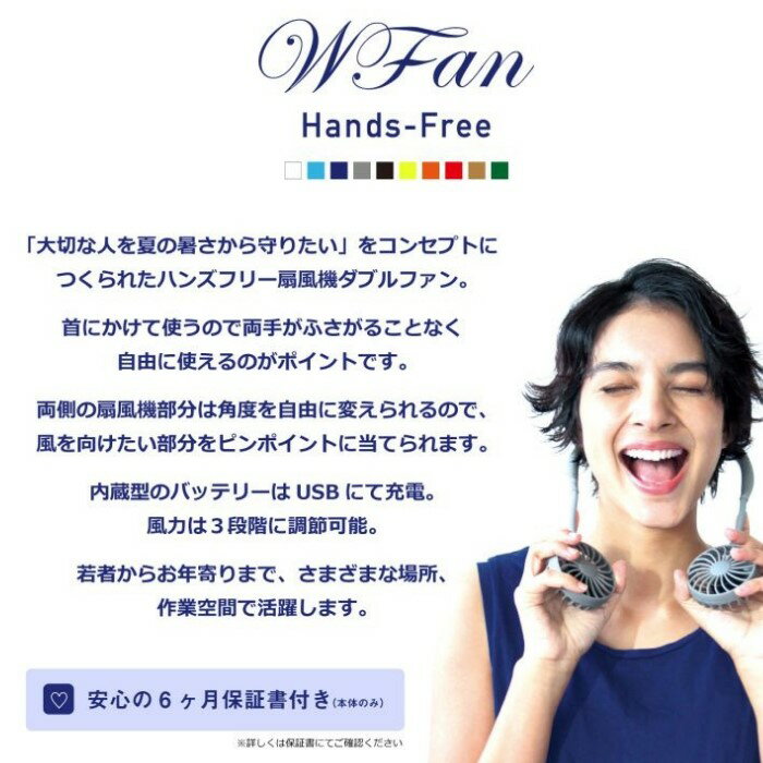 SPICE OF LIFE ハンズフリー ポータブル 扇風機 W FAN ブラック 携帯用 肩掛け USB充電式 風量3段階調節 角度調整 羽根 ダブルファン DF30SS01 関連特集ページ 商品名 SPICE OF LIFE ハンズフリー ポータブル 扇風機 W FAN ブラック 携帯用 肩掛け USB充電式 風量3段階調節 角度調整 羽根 ダブルファン DF30SS01 品番 DF30SS01 カラー イエロー(YE)ブラック(BK)ホワイト(WH)レッド(RD)オレンジ(OR)ネイビー(NY)アイスブルー(MT)カーキ(KH)グレー(GY)ブラウン(BR) 商品概要 ・充電時間:約3時間 ・いつでもどこでも、首にかけるだけの携帯用扇風機です。