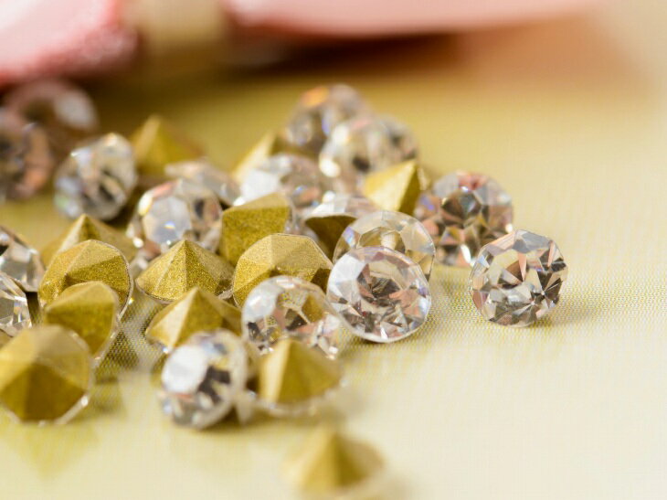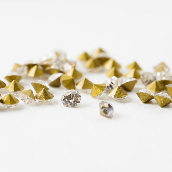 キラキラ煌めくダイヤカットのガラスラインストーンです!底がVにカットされたストーンは、ボリューミーで立体的なアートやビジューアクセサリーが簡単に手作りできちゃう優秀アイテム◎フラワーカボション・パールビーズなどのジュエリーパーツやメタルチャームもプラスして、ゴージャスなデザインを楽しんじゃおう!色々な使い方・作り方レシピを考えるとウキウキしてきますね。