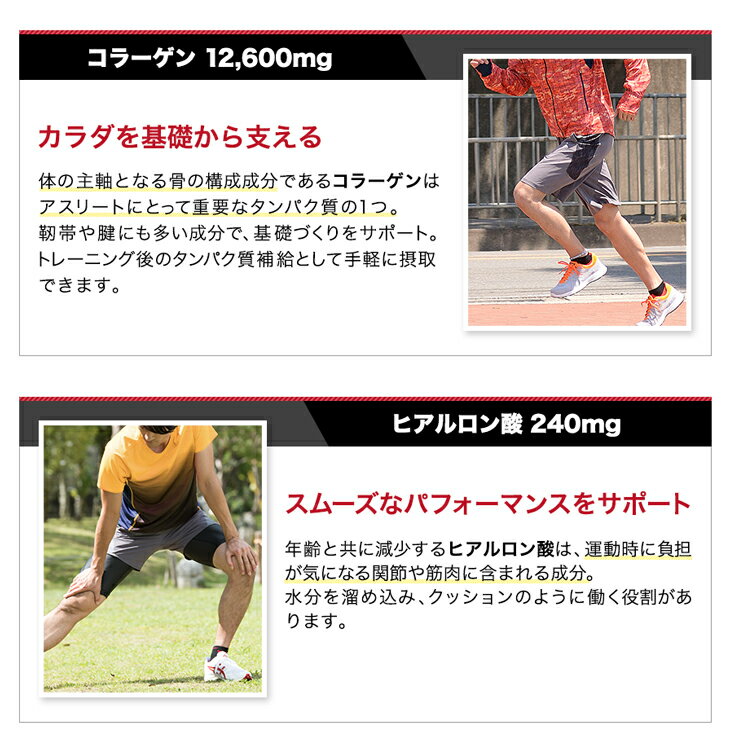 】 骨をサポートするコラーゲン12600mg、関節の動きをサポートする保湿成分のヒアルロン酸240mg、外部刺激からお肌を守るセラミド1.2mg配合。